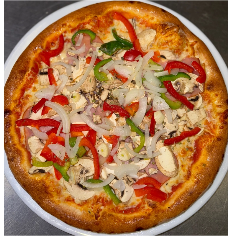 Tomatensaus, kaas, ham, champignon., ui, paprika en knoflook